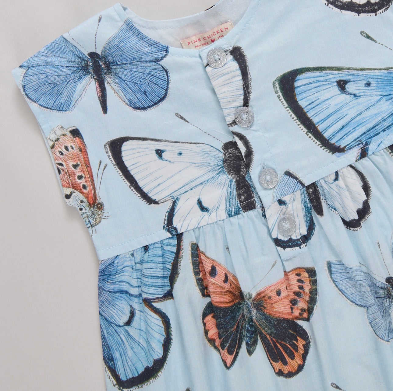 A fluttery favorite for sunny spring days! The Baby Girls Alexandra Jumper features a dreamy blue vintage butterfly print in airy 100% cotton voile. Designed with a sleeveless silhouette, silver glitter buttons at the front, and ring snap closures for easy diaper changes, this lightweight one piece is perfect for warm weather dressing.