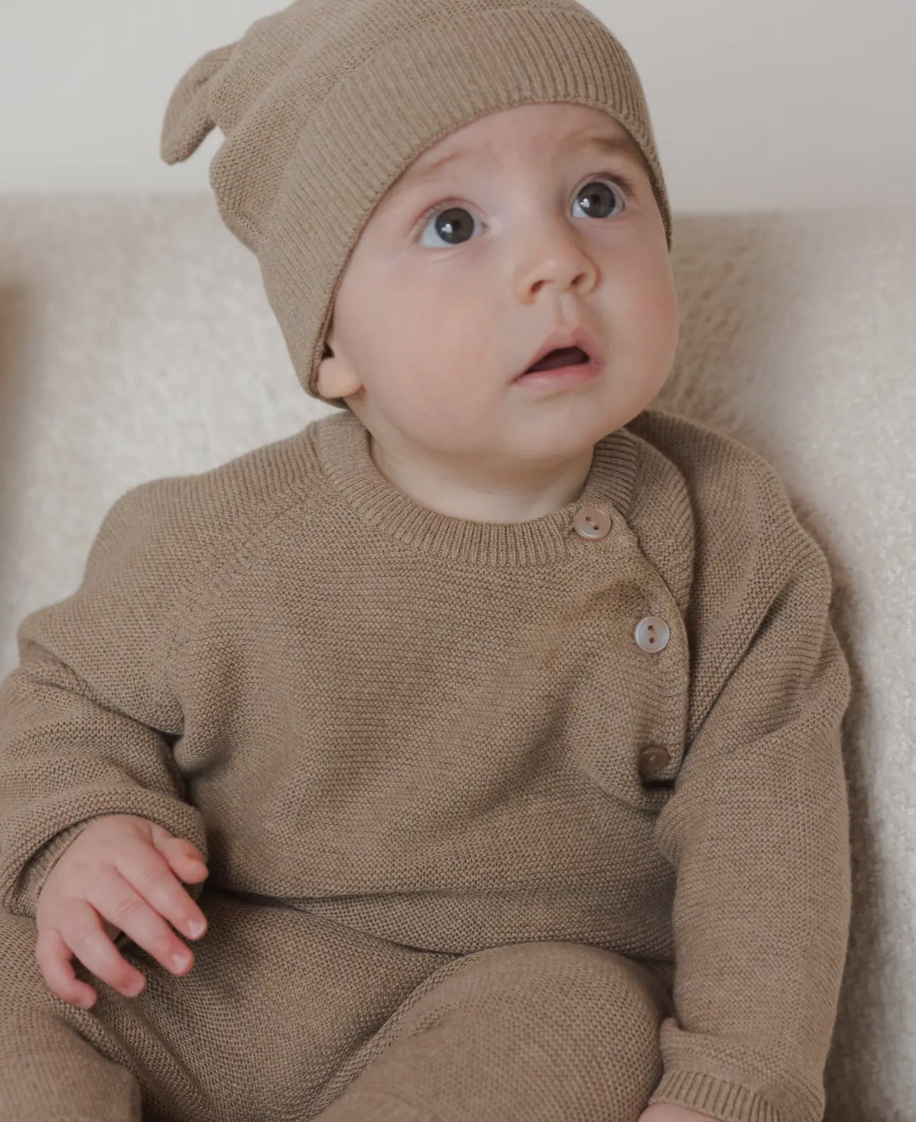 Quincy Mae's Bailey Knit Sweater features ribbing at the neck, wrists, and waist, with faux shell buttons along its raglan seam for added ease and style. Pair with Knit Pant to complete your little one's look.