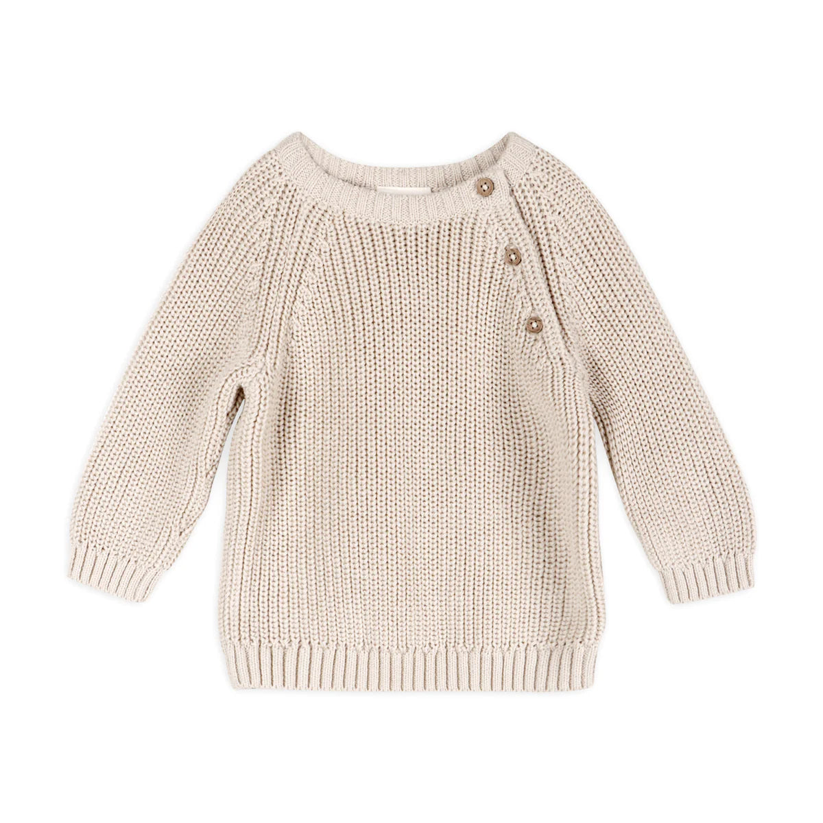 100% organic cotton chunky sweater knit baby pullover with buttons.