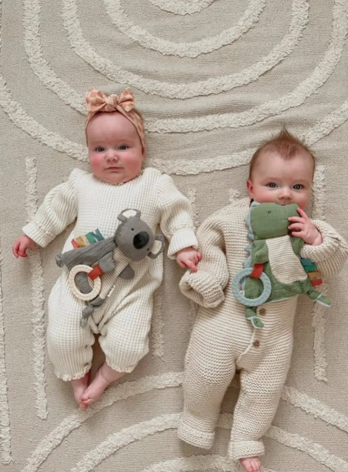 Meet bitzy crinkle™, a loveable sensory toy that crinkles and excites. With features like soft natural cotton fabric, textured ribbons and a braided teether, baby will love to explore this new friend. Watch as your little one is captivated by crinkles and giggles.