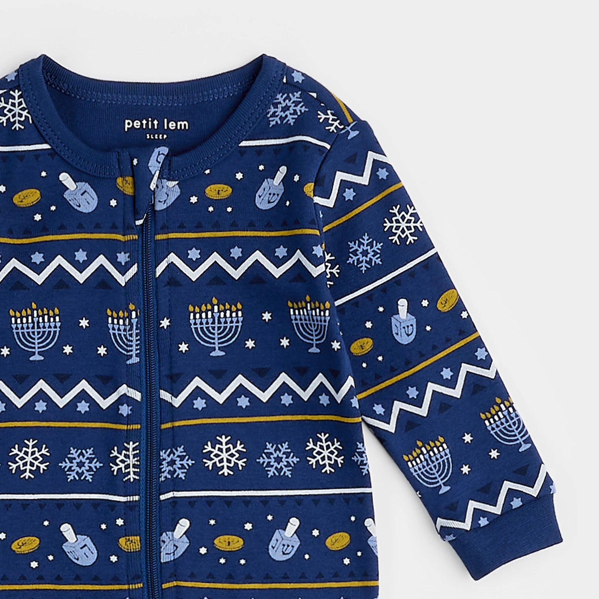 Light up your Hanukkah nights with this adorable Fair Isle footed sleeper. Made from the softest organically grown cotton, the footed sleeper will keep them toasty during family gatherings or through the night. Fitted with a two-way zip, the one-piece makes it easy for mom and dad to perform quick diaper changes without removing the whole suit.