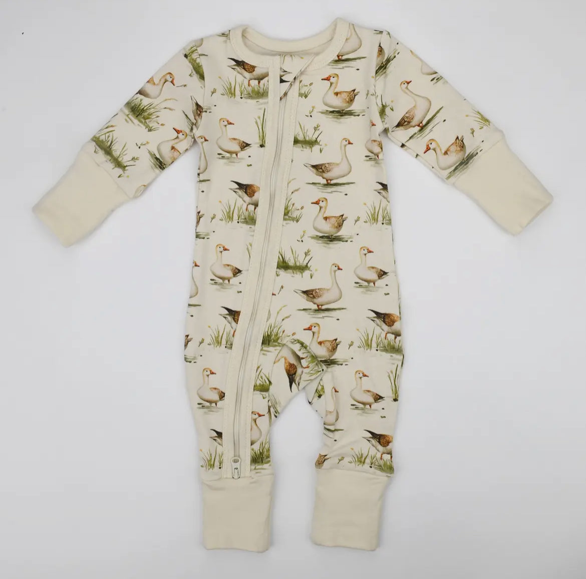 Ultra soft & stretchy 98% Organic Cotton with 2% Spandex- creating a natural, breathable, durable, stretchable fabric unlike any other. High quality printing that is very soft to the touch. One zip to put on. Zips all the way down one leg for easy dressing. Durable YKK double zipper also zips up for quick diaper changes. Fold over cuffs on hands and feet create a versatile sleeper that keeps baby's hands and feet warm when it's cold. Designed in Idaho and made with love by a small business entrepreneur in India.