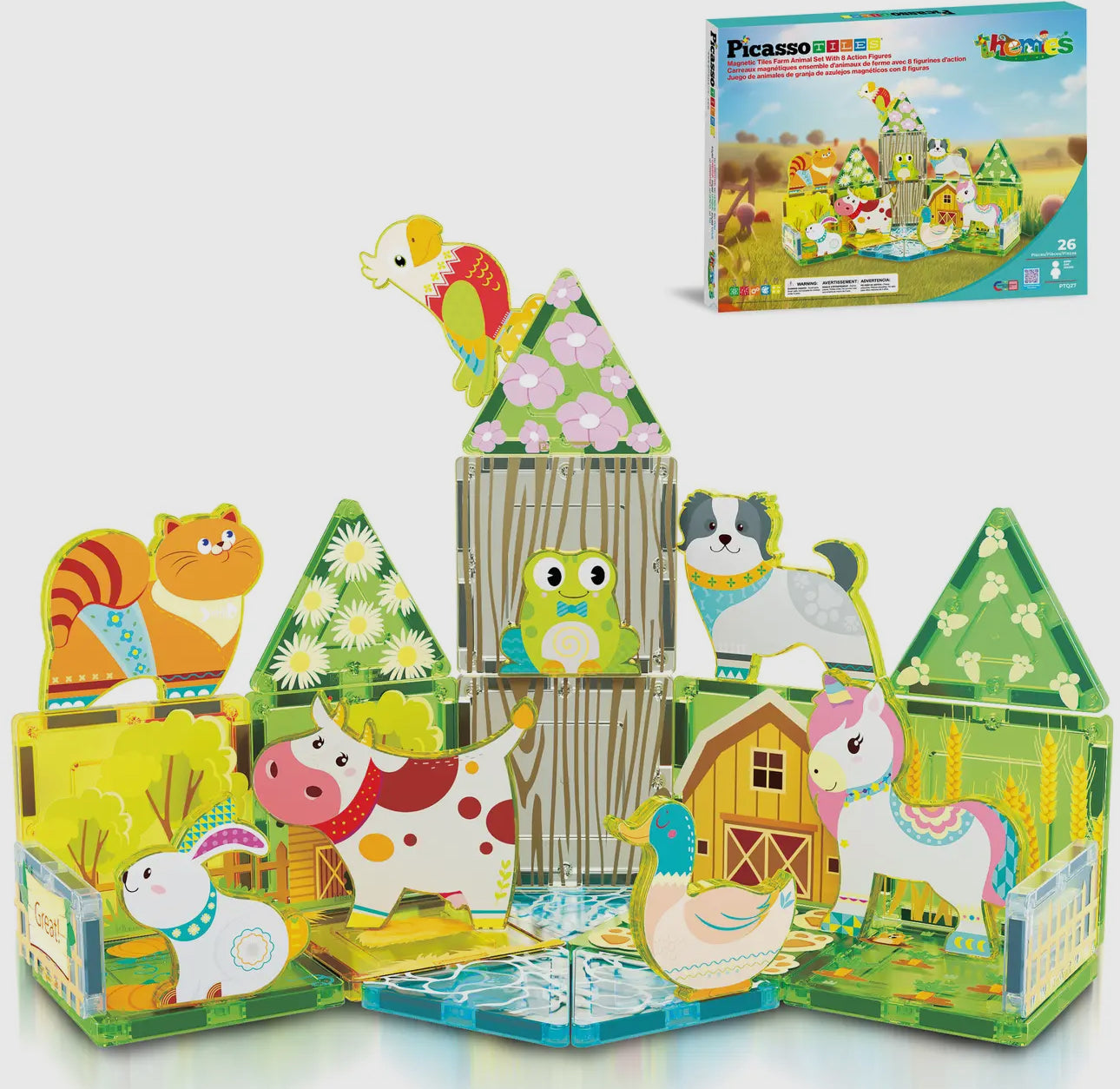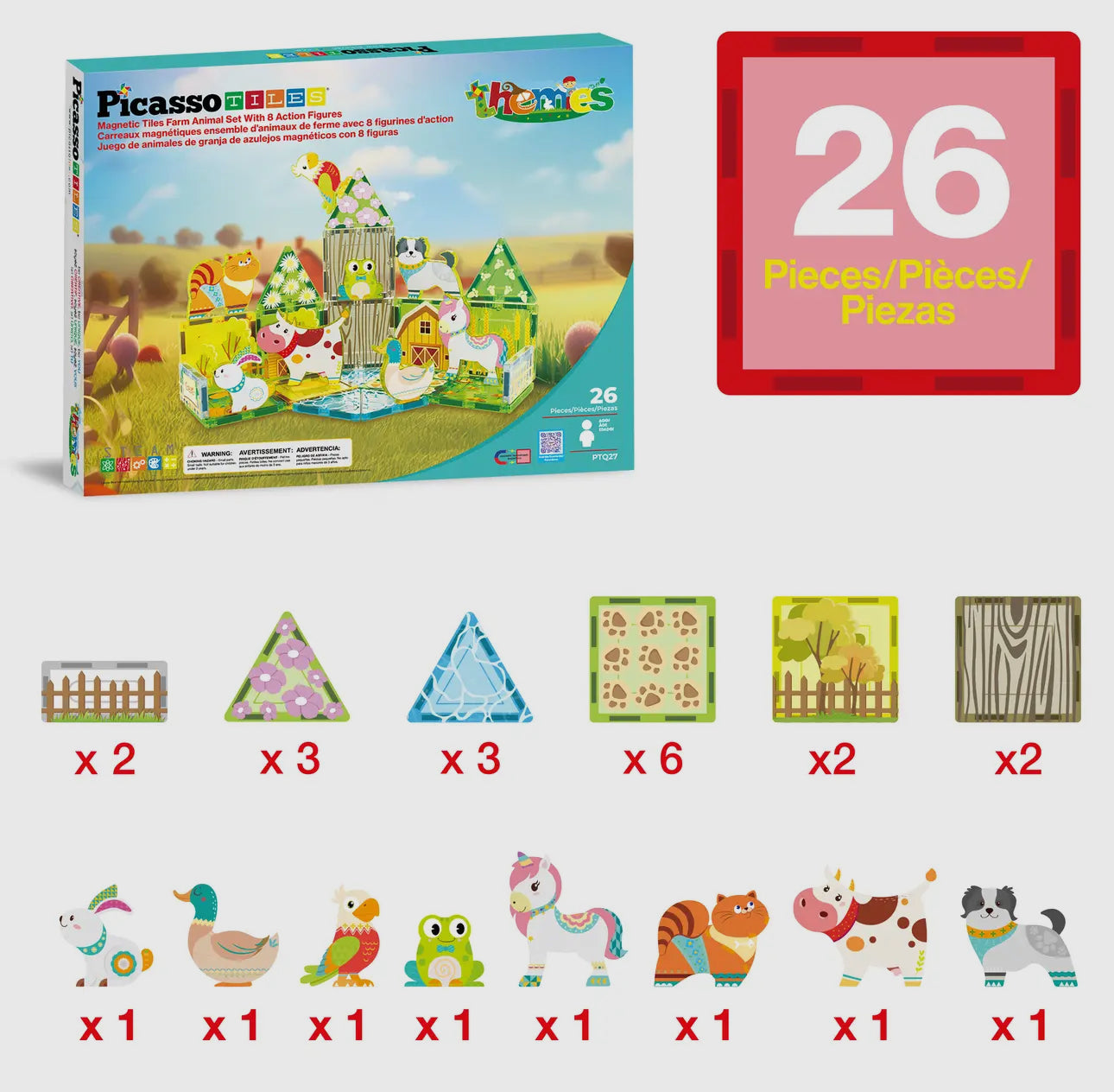 Discover the PicassoTiles Fall-Themed Magnetic Set , featuring 18 beautifully crafted magnet tiles with autumn designs and 8 charming farmyard animals: a rabbit, duck, parrot, frog, unicorn, cat, cow, and dog. Perfect for ages 3 and up, this set inspires imaginative play and storytelling while enhancing fine motor skills and cognitive development. Let your child explore the joys of farm life in the fall with endless creative possibilities!